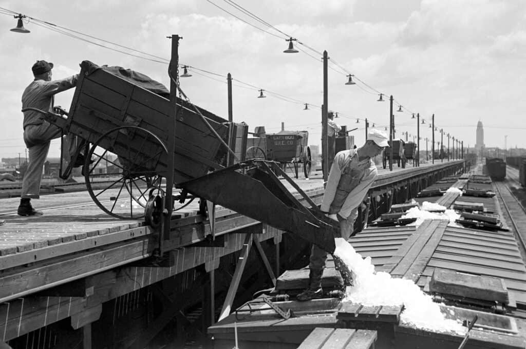Icing down a refrigerated train car outside of Lincoln, Nebraska, 1948. Credit: Newberry Library/CARLI Digital Collections