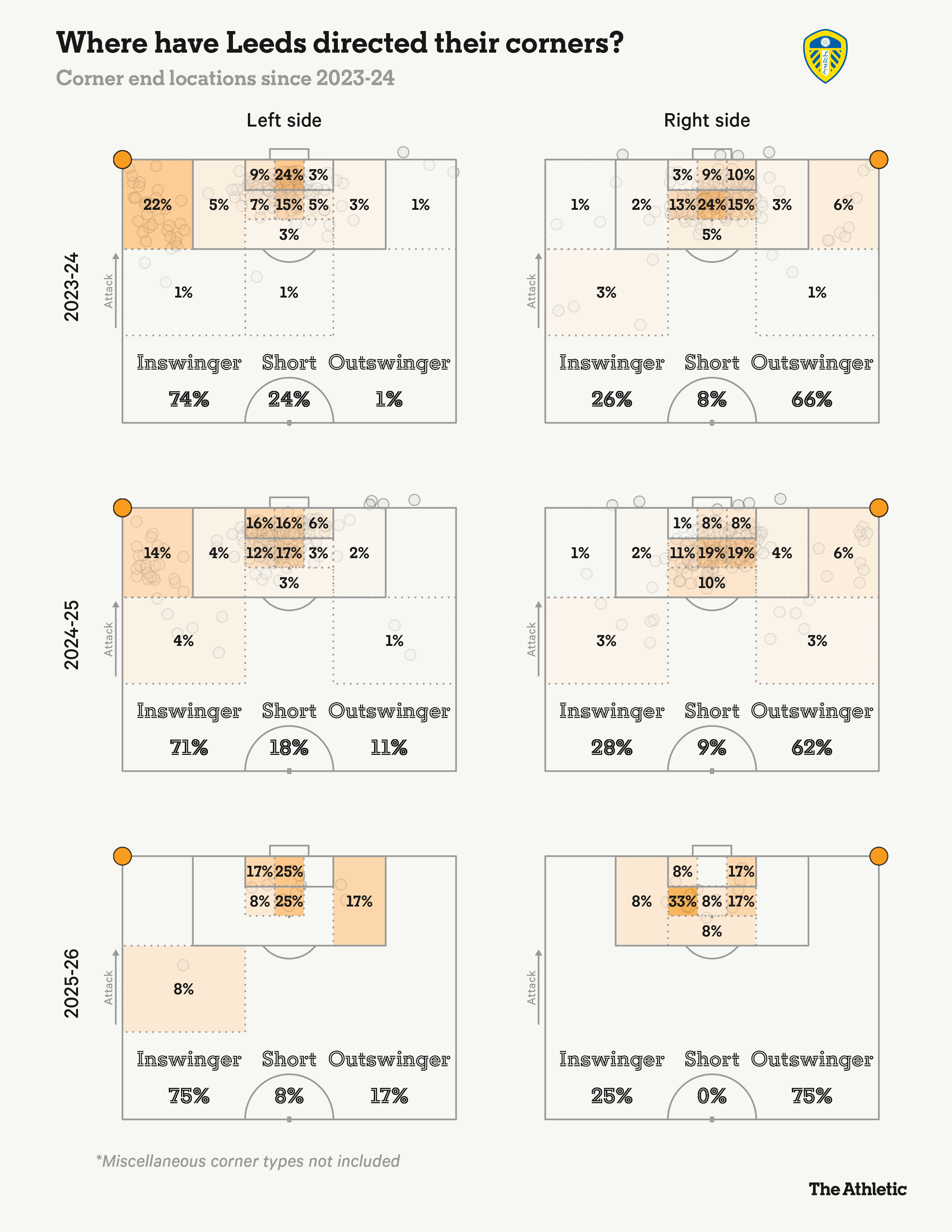 This routine of corners inswinging from the left and outswinging from the right followed the pattern we have seen under Farke since 2023-24. The sample size for this season remains too small to scrutinise convincingly, but in the last two campaigns, there has been an evident appetite for going short from the left, aside from the predictable six-yard-box targets on both sides.