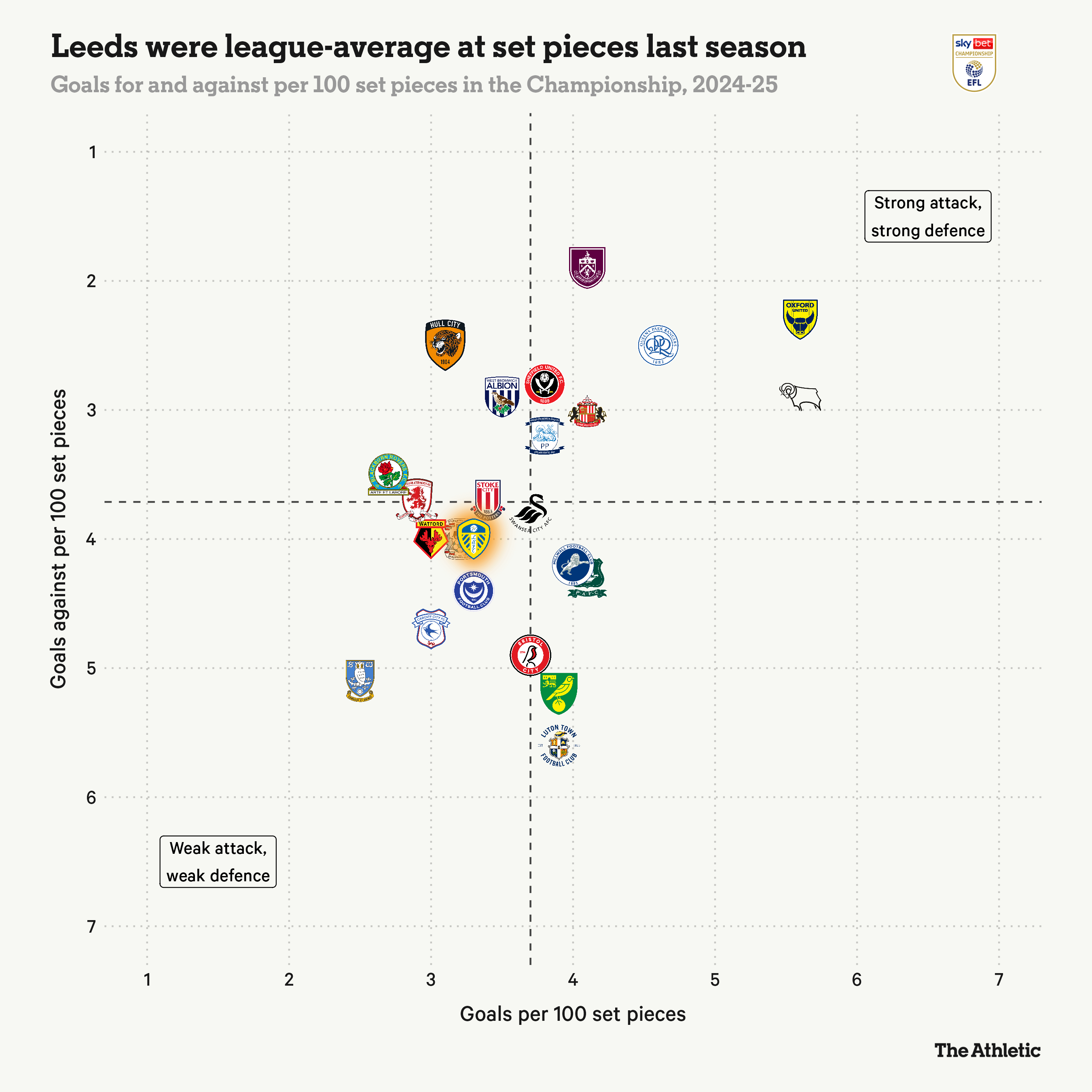 Leeds scored 11 goals from corners en route to the Championship title last season, but also had more of them than any other team at 327. When you look at goals for and against per 100 set pieces across last season, United were average.