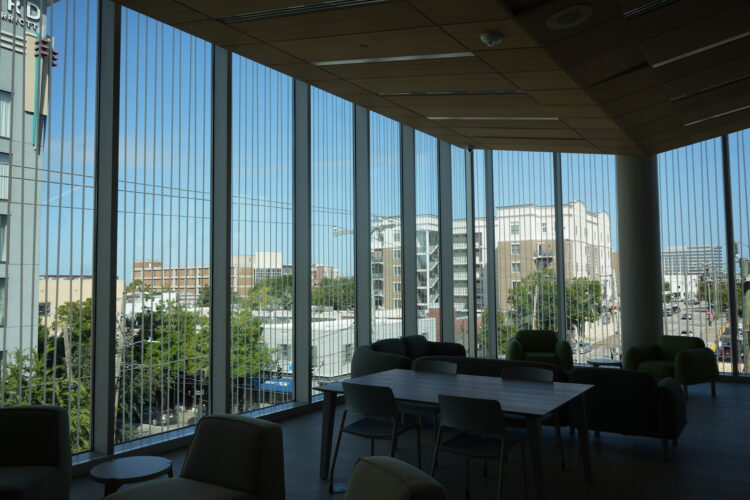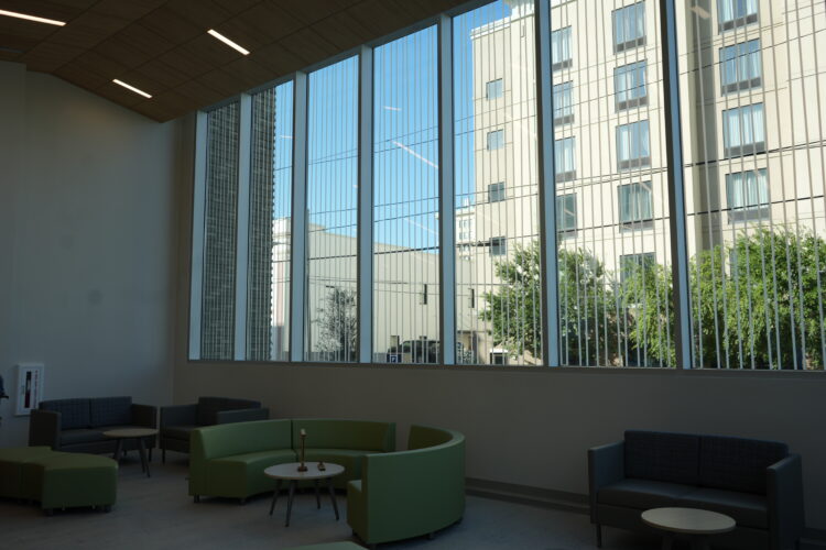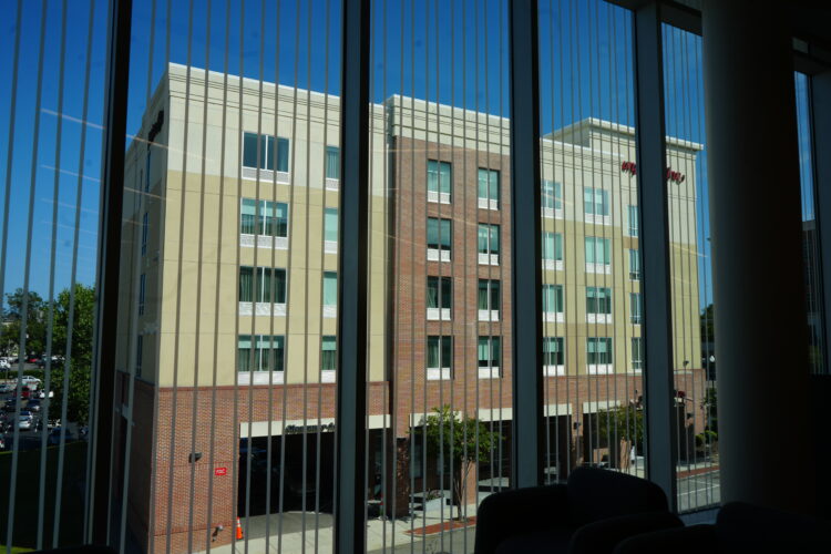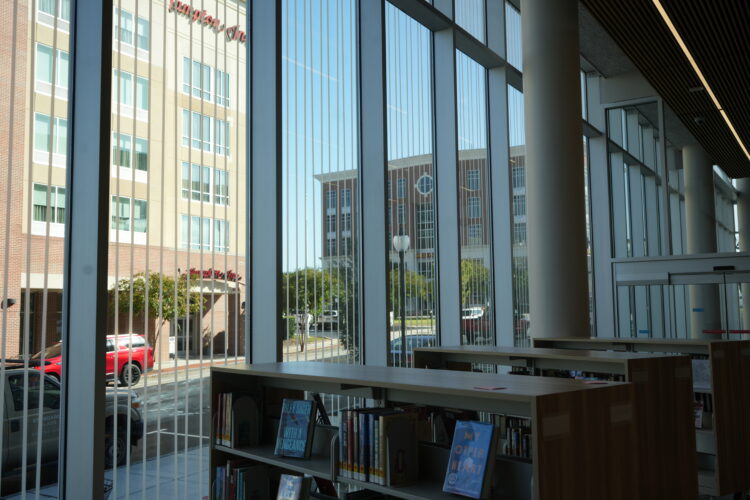 The building’s windows are designed with fritting to deter birds and heat; Conners also said they were designed to look like book pages. (Port City Daily/Brenna Flanagan)