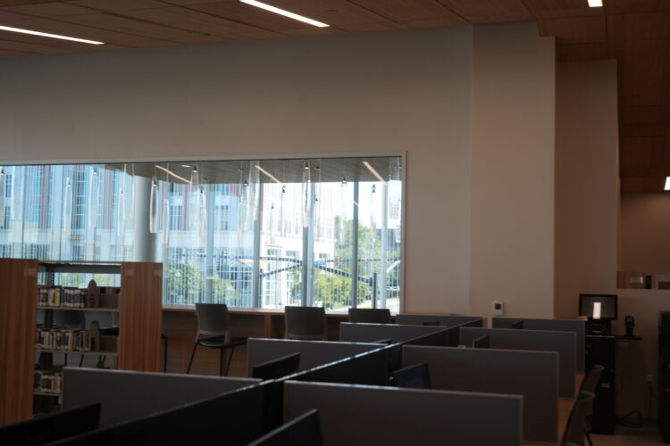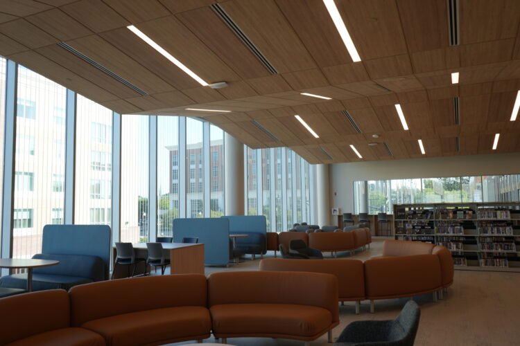Much of the seating area is situated near the building’s massive windows, which have been designed with glass printed with ink, which contains ultra-small ground glass particles, also known as “frit.” The design’s purpose is three-fold — to reduce bird collisions with the windows, to help cool the building and ease the burden on its solar panels, and because it looks like the pages of a book.