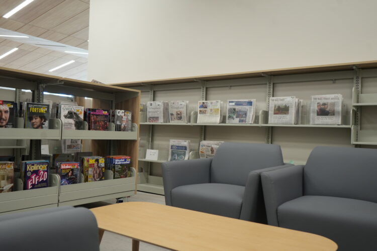 The magazine and newspaper area upstairs in the new main library branch. (Port City Daily/Brenna Flanagan)