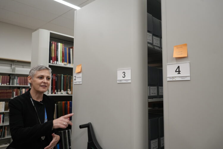 Library Director Dana Conners demonstrates the compact shelving used in the library’s local history room. (Port City Daily/Brenna Flanagan)