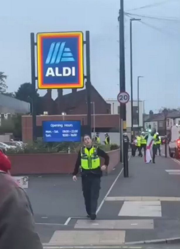 It showed an officer calmly speaking to residents on the roadside outside Aldi at the junction of Hazelwell Lane/Pershore Road while a group of men in hi-vis tabards were visible with flags behind them.