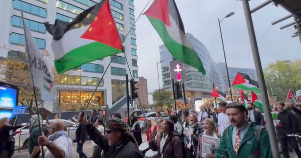 Pro-Palestinian protestors march in Manchester centre last night(Image: SWNS)