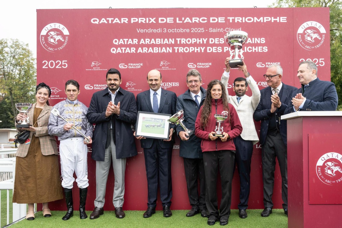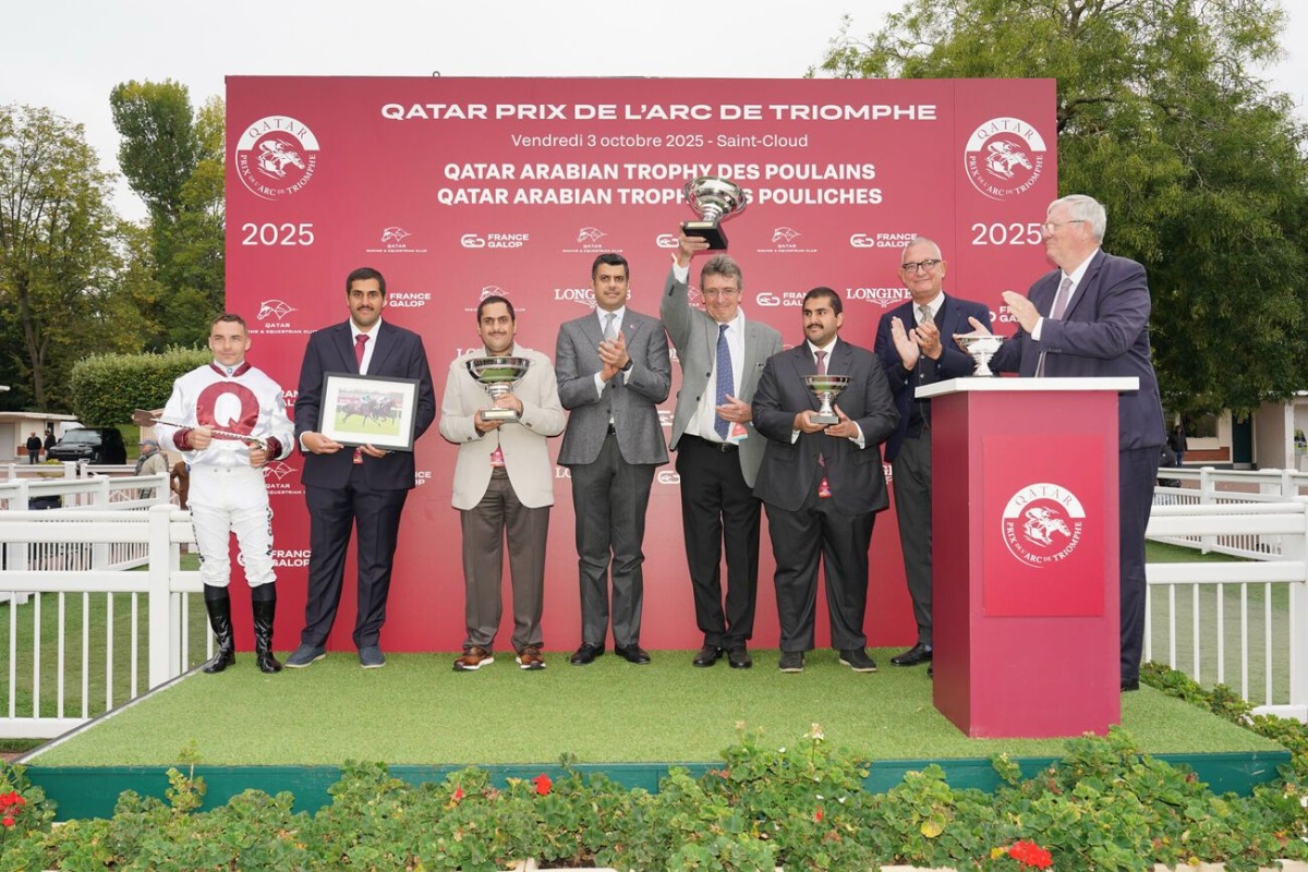 Qatari victories continued on the day with Al Wasmiyah Racing’s homebred star Laffan winning the Gr1 PA Qatar Arabian Trophy des Poulains. Hamad bin Abdulrahman Al Attiyah, QREC Chairman, presented the owner trophy to Ali bin Hamad Al Attiyah, Abdulla bin Hamad Al Attiyah and Mohammed bin Hamad Al Attiyah and crowned the winning trainer François Rohaut and the winning jockey Christophe Soumillon.