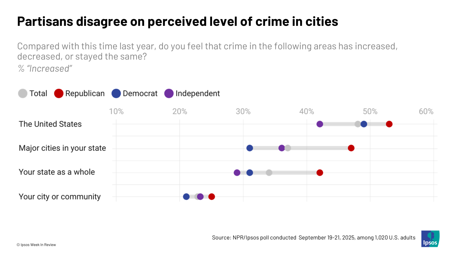 2. Perceived levels of crime. A shared reality is not a given in today’s America. Relatively few Republicans and Democrats feel that crime has increased in their local area. What about crime in cities? It depends on who you ask.