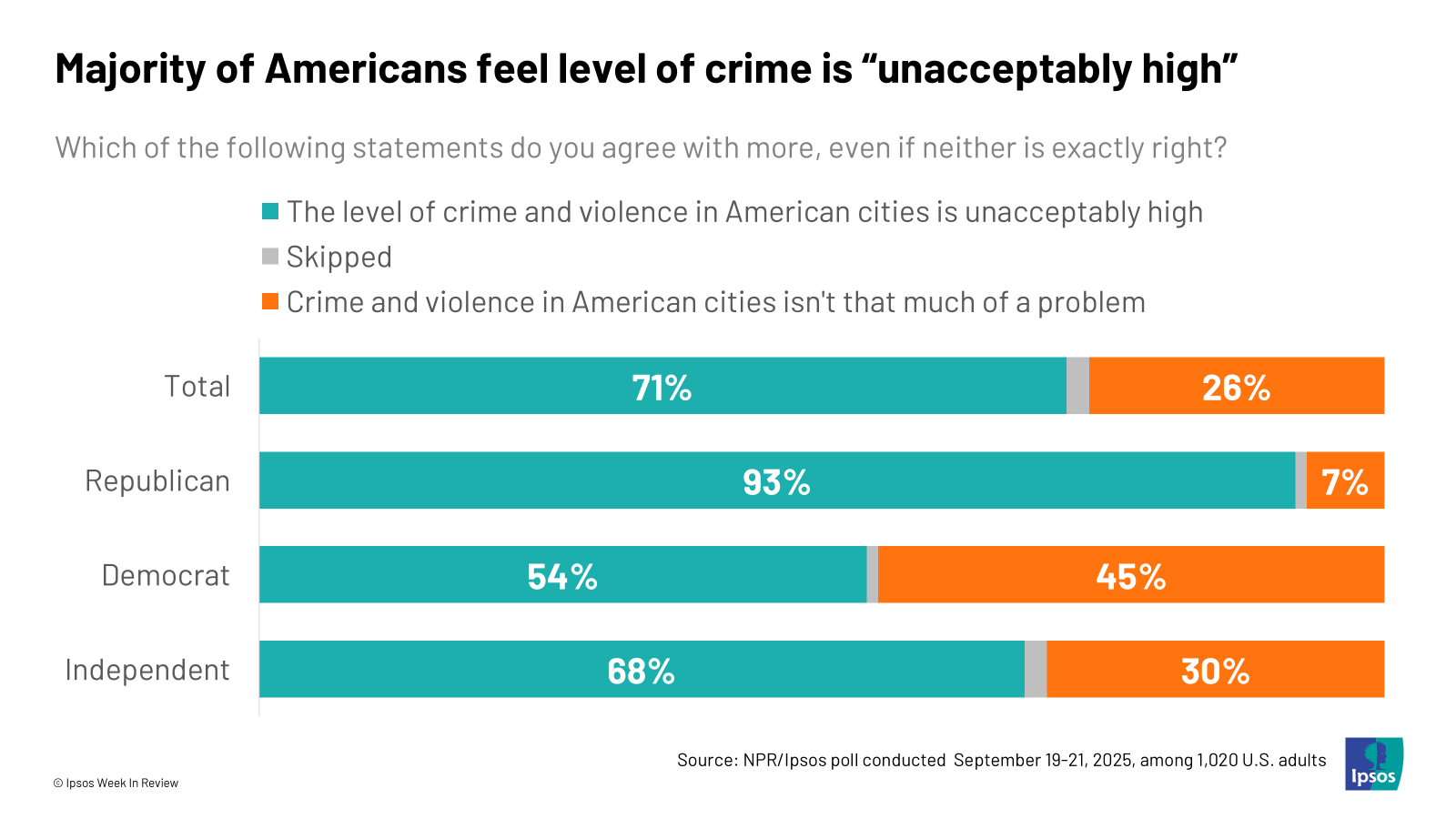 3. The level of crime in cities. While the perceived level of crime in cities is debated, the majority of Americans feel that crime and violence in American cities is unacceptably high, even beyond partisanship.