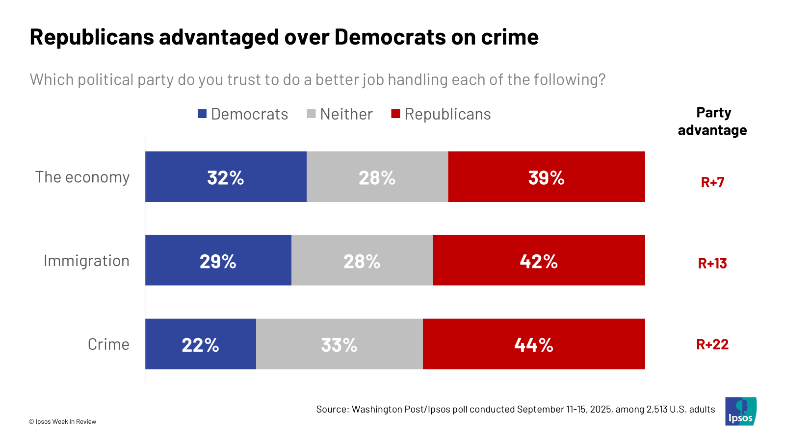 5. Not a Republican weakness. Relatively support for these deployments doesn’t mean that it’s a Trump or Republican weakness. In fact, when Americans are asked to choose between Republicans or Democrats on crime, Republicans have a substantial advantage.