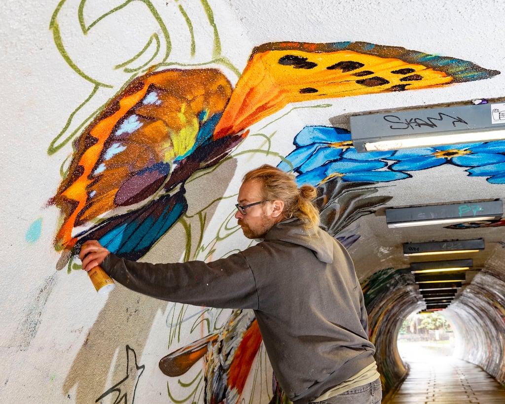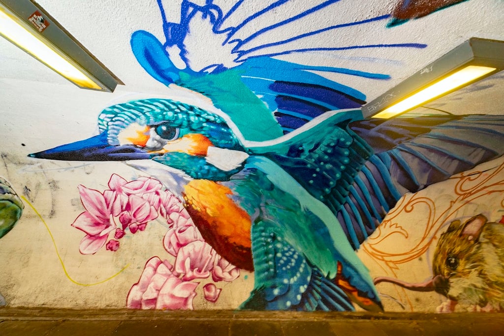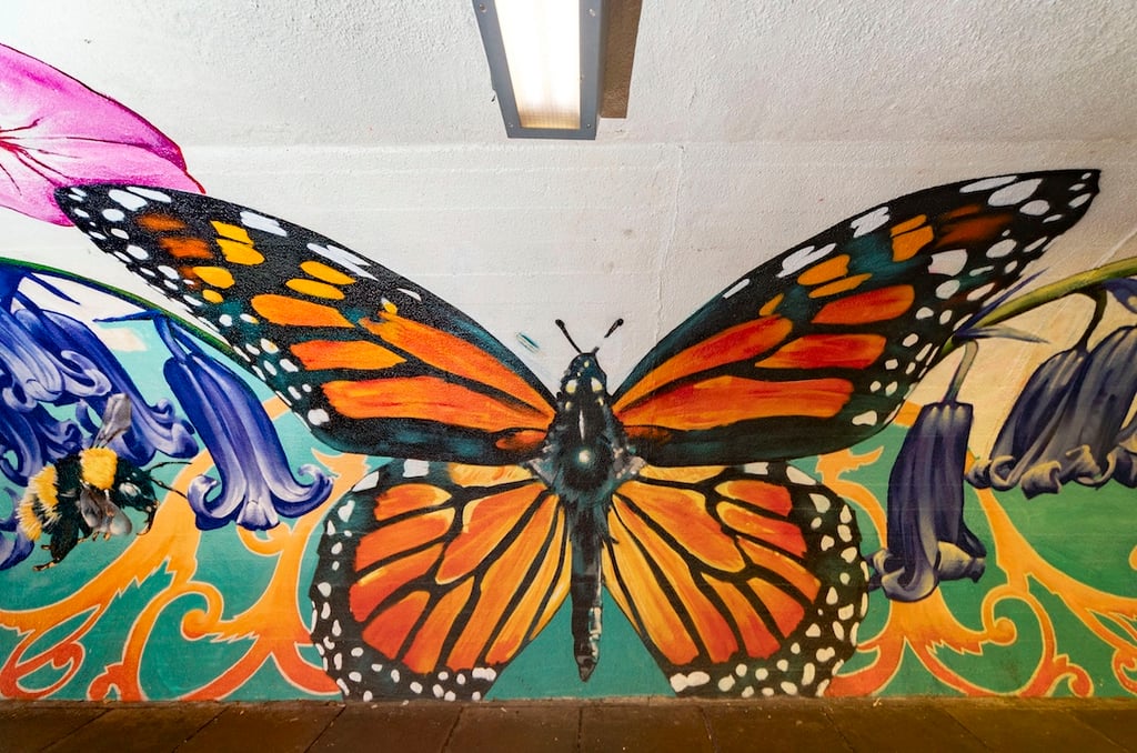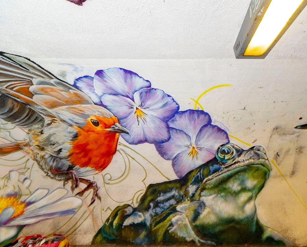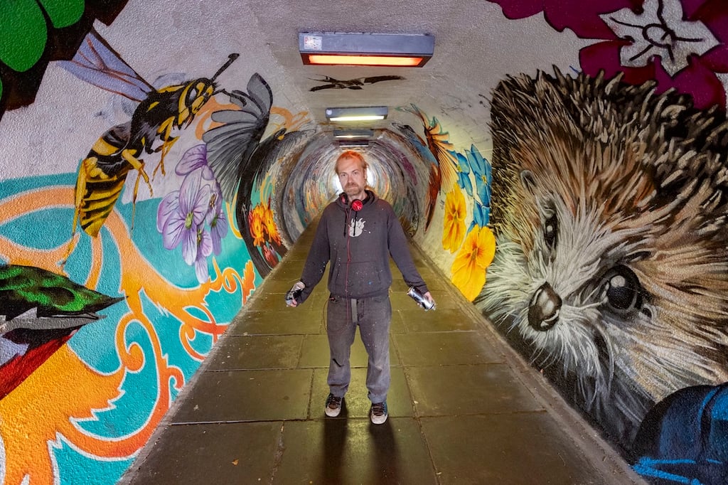 The arched surface – all 276 square metres of it – is now filled with dozens of giant colourful spray painted flora and fauna including otters, ducks, foxes, herons, hedgehogs, frogs, rabbits, badgers, birds, bees, beetles and butterflies.