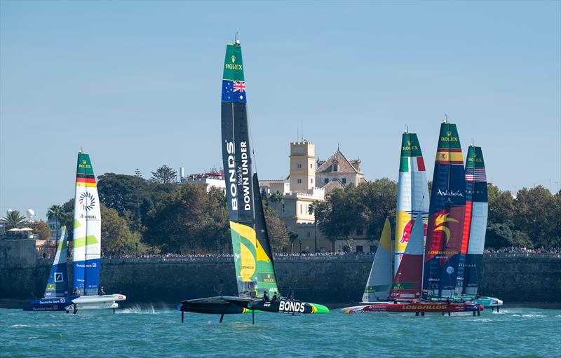 The SailGP fleet with BONDS Flying Roos SailGP Team chasing Spain SailGP Team, Red Bull Italy SailGP Team, USA SailGP Team and Germany SailGP Team presented by Deutsche Bank on Race Day 1 of the DP World Spain Sail Grand Prix © Ricardo Pinto for SailGP