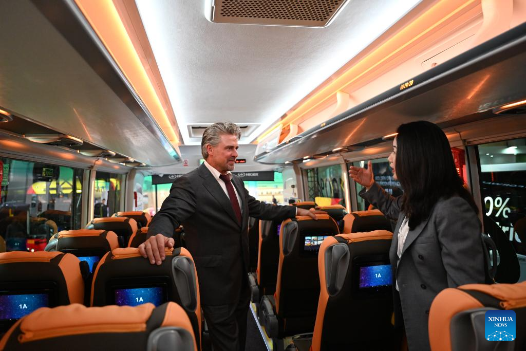 A staff member (R) introduces the interior of Higer’s newly launched high-end tourist coach V12E Pro to a visitor during Busworld Europe in Brussels, Belgium, on Oct. 4, 2025. The 27th edition of Busworld Europe is being held at Brussels Expo, Belgium, from Oct. 4 to 9, 2025. As the world’s leading biennial trade fair for the coach and bus industry, Busworld welcomes exhibitors and professionals from around the globe to showcase the latest vehicles, technologies, and innovations. (Xinhua/Lyu You)