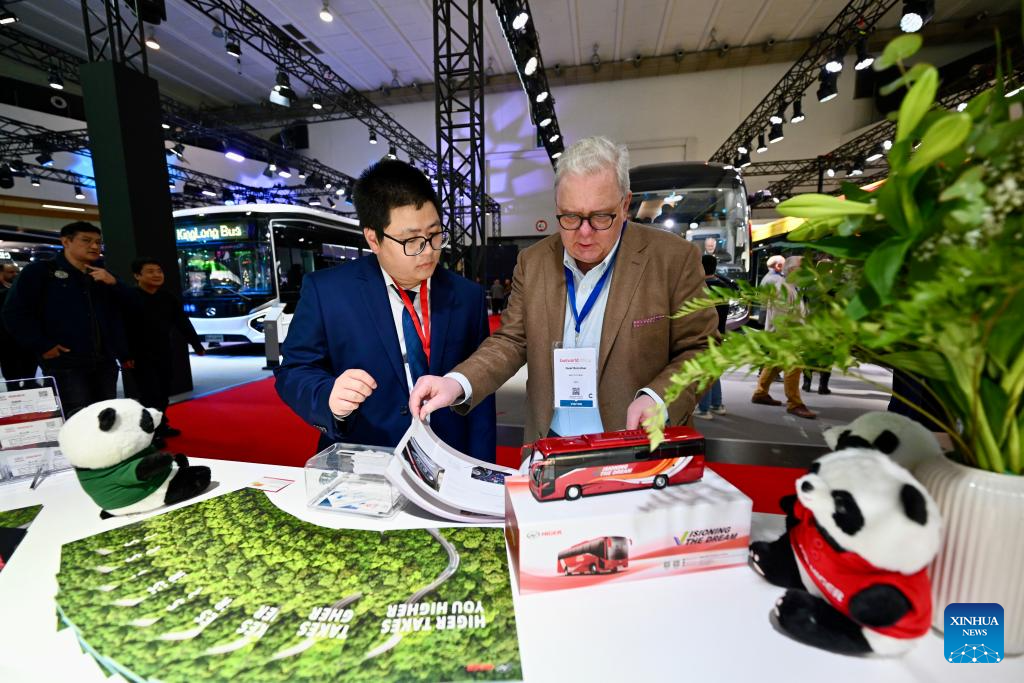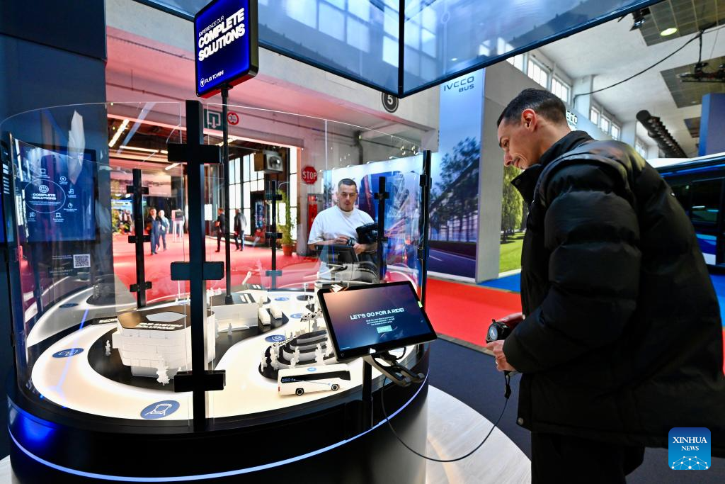 Exhibitors introduce their solutions to visitors during Busworld Europe in Brussels, Belgium, on Oct. 4, 2025. The 27th edition of Busworld Europe is being held at Brussels Expo, Belgium, from Oct. 4 to 9, 2025. As the world’s leading biennial trade fair for the coach and bus industry, Busworld welcomes exhibitors and professionals from around the globe to showcase the latest vehicles, technologies, and innovations. (Xinhua/Lyu You)