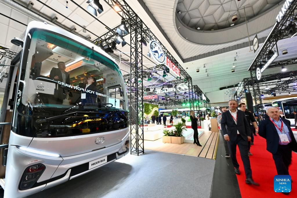 Visitors walk past the Higer booth during Busworld Europe in Brussels, Belgium, on Oct. 4, 2025. The 27th edition of Busworld Europe is being held at Brussels Expo, Belgium, from Oct. 4 to 9, 2025. As the world’s leading biennial trade fair for the coach and bus industry, Busworld welcomes exhibitors and professionals from around the globe to showcase the latest vehicles, technologies, and innovations. (Xinhua/Lyu You)
