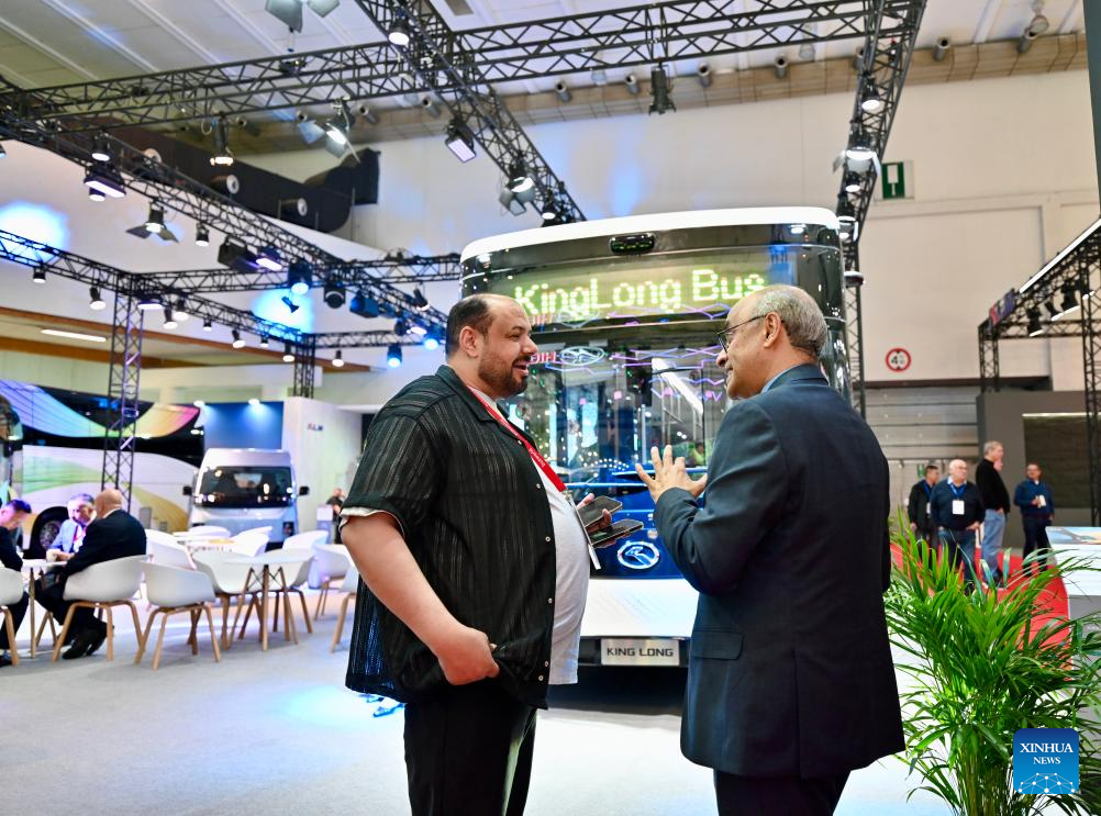Visitors communicate at the King Long booth during Busworld Europe in Brussels, Belgium, on Oct. 4, 2025. The 27th edition of Busworld Europe is being held at Brussels Expo, Belgium, from Oct. 4 to 9, 2025. As the world’s leading biennial trade fair for the coach and bus industry, Busworld welcomes exhibitors and professionals from around the globe to showcase the latest vehicles, technologies, and innovations. (Xinhua/Lyu You)