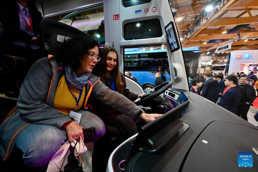 Visitors experience the driver’s cabin of a Yutong tourist coach during Busworld Europe in Brussels, Belgium, on Oct. 4, 2025. The 27th edition of Busworld Europe is being held at Brussels Expo, Belgium, from Oct. 4 to 9, 2025. As the world’s leading biennial trade fair for the coach and bus industry, Busworld welcomes exhibitors and professionals from around the globe to showcase the latest vehicles, technologies, and innovations. (Xinhua/Lyu You)