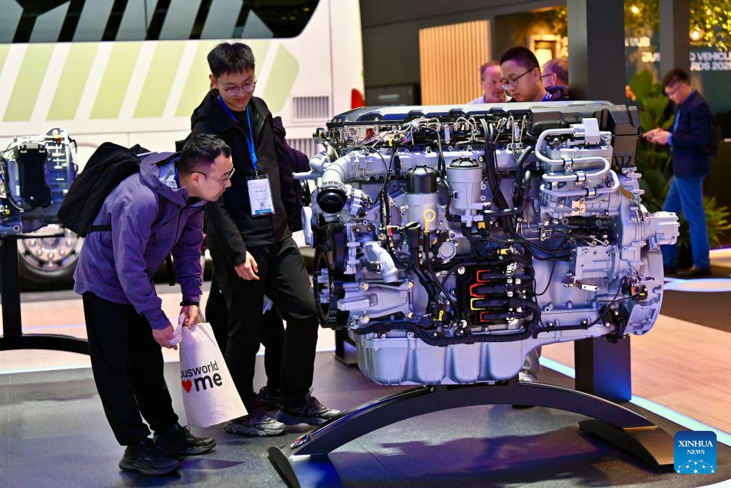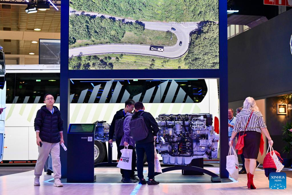 Visitors view a core component on display at the Scania booth during Busworld Europe in Brussels, Belgium, on Oct. 4, 2025. The 27th edition of Busworld Europe is being held at Brussels Expo, Belgium, from Oct. 4 to 9, 2025. As the world’s leading biennial trade fair for the coach and bus industry, Busworld welcomes exhibitors and professionals from around the globe to showcase the latest vehicles, technologies, and innovations. (Xinhua/Lyu You)
