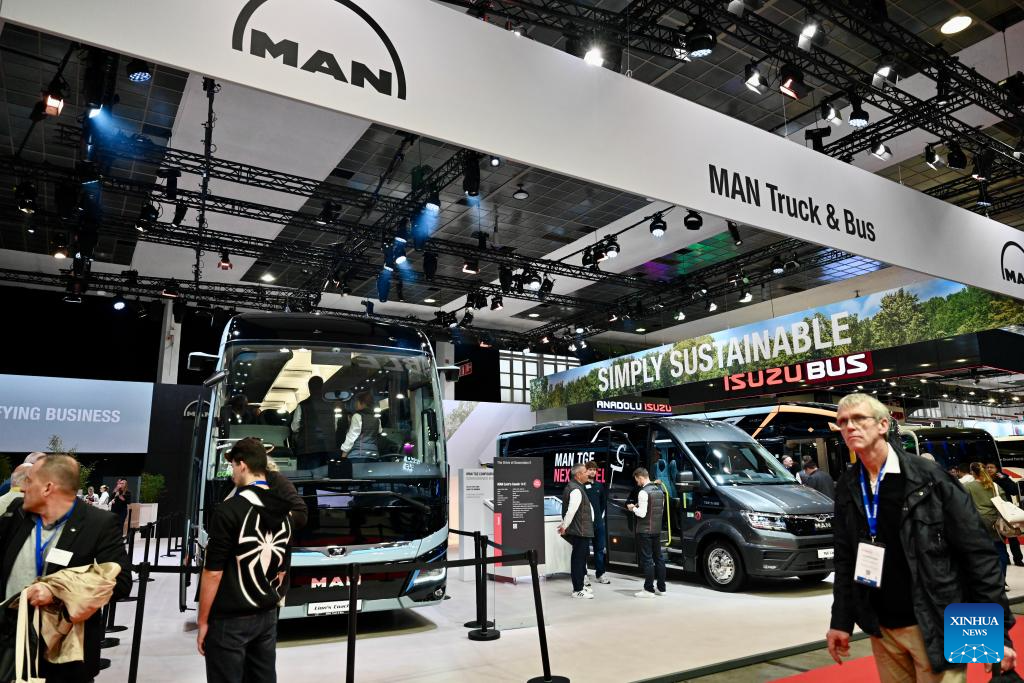 Visitors walk past the booth of MAN Truck & Bus during Busworld Europe in Brussels, Belgium, on Oct. 4, 2025. The 27th edition of Busworld Europe is being held at Brussels Expo, Belgium, from Oct. 4 to 9, 2025. As the world’s leading biennial trade fair for the coach and bus industry, Busworld welcomes exhibitors and professionals from around the globe to showcase the latest vehicles, technologies, and innovations. (Xinhua/Lyu You)