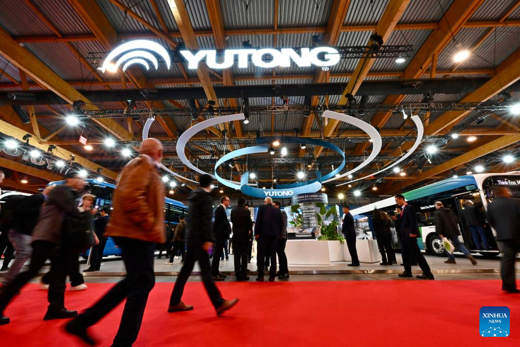 Visitors walk past the Yutong booth during Busworld Europe in Brussels, Belgium, on Oct. 4, 2025. The 27th edition of Busworld Europe is being held at Brussels Expo, Belgium, from Oct. 4 to 9, 2025. As the world’s leading biennial trade fair for the coach and bus industry, Busworld welcomes exhibitors and professionals from around the globe to showcase the latest vehicles, technologies, and innovations. (Xinhua/Lyu You)