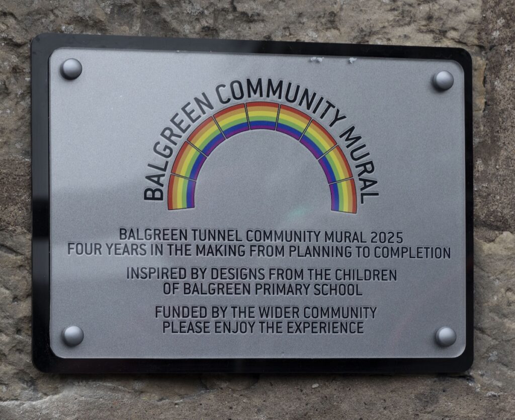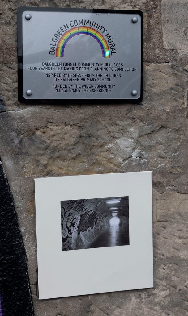 The commemorative plaque at the Balgreen Tunnel Community Mural 3 October PHOTO Alan Simpson