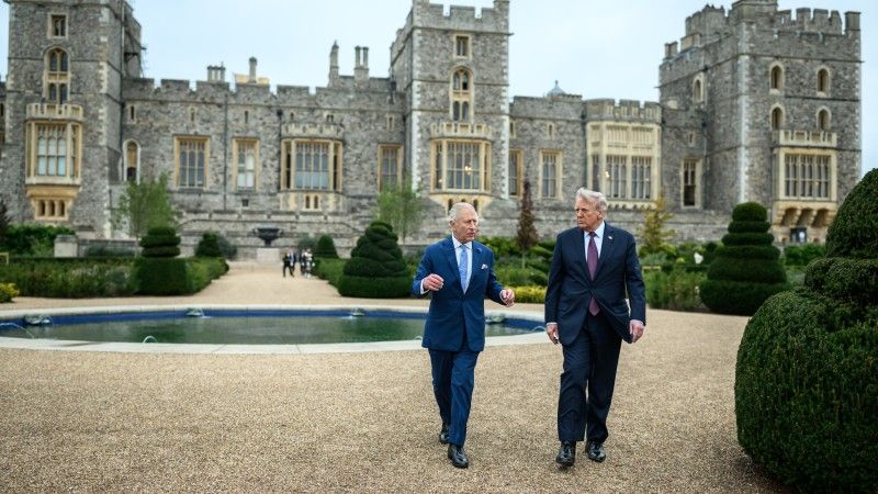 The decision to host the President in the secure and more private location at Windsor Castle reflected the security concerns caused by the feeling of opposition from some sections of society to the visit.  It was in the grounds of Windsor Castle that the UK Armed Forces put on their most consequential display to make sure the president felt duly honoured. This was a fundamental part of the diplomatic strategy. The military and ceremonial honours included 1,500 all-service military personel,150 horses and marching bands from the Royal Marines, the Army and the Royal Air Force. The Red Arrows display team flew its impressive display however the fly past of the US Air Force F-35s who were due to fly symbolically with the RAF had to be cancelled due to bad weather!