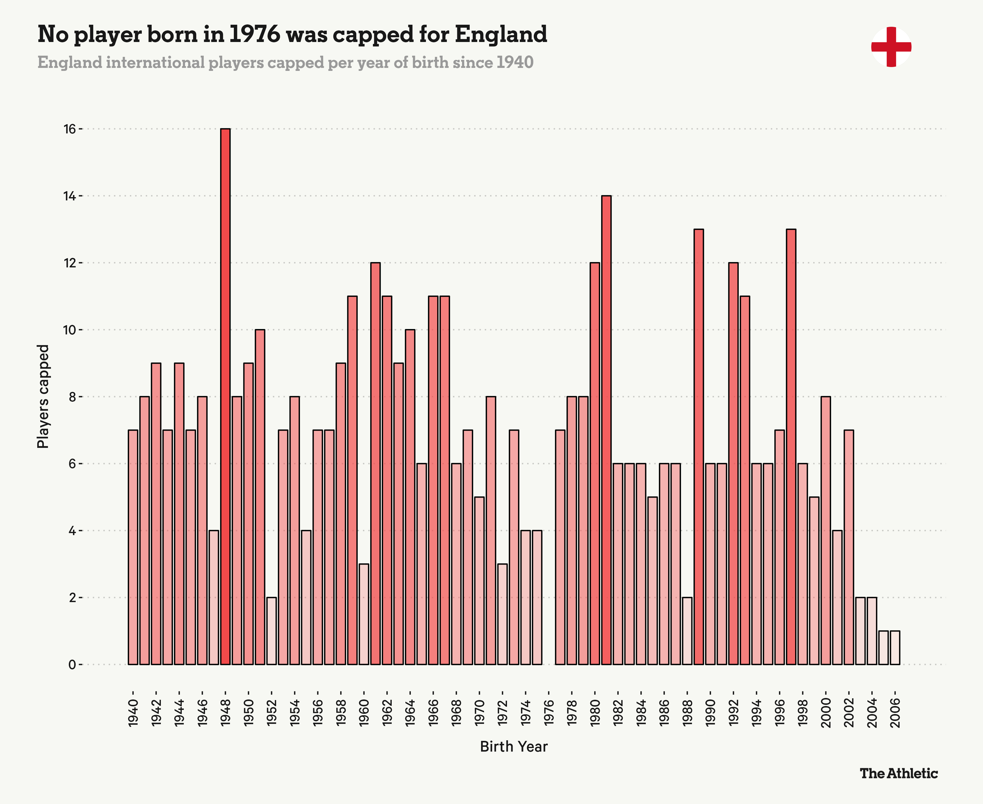 To those of you turning 50 next year: firstly, commiserations. Secondly, why were you lot so bad at football? For some reason, not a single 1976-born player ever represented England. It’s the only year of the entire 20th century that failed to contribute even one.