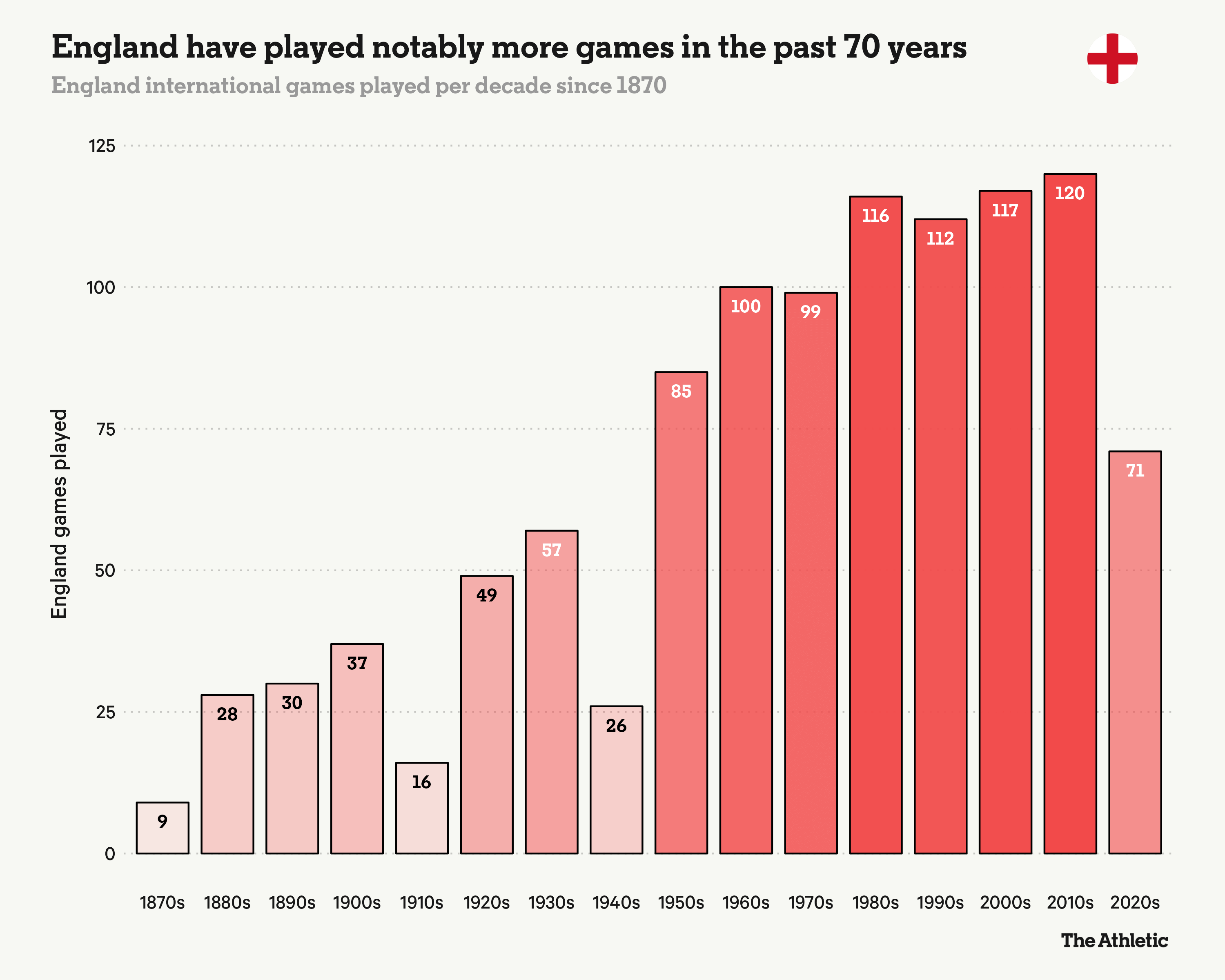 Before we get into the specifics about caps won, we need to consider a couple of key points. It’s impossible to ignore the fact that England started playing matches much more regularly from midway through the 20th century, and therefore comparing numbers from before that point isn’t worthwhile. Since the 1980s, the number of games played per decade has been relatively consistent.