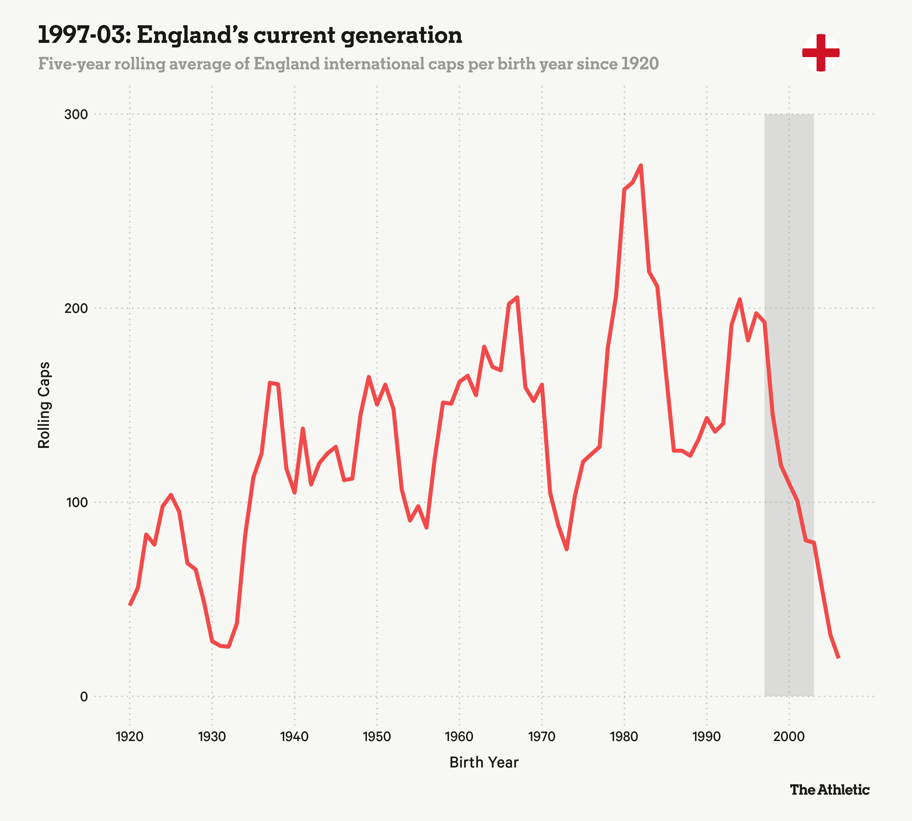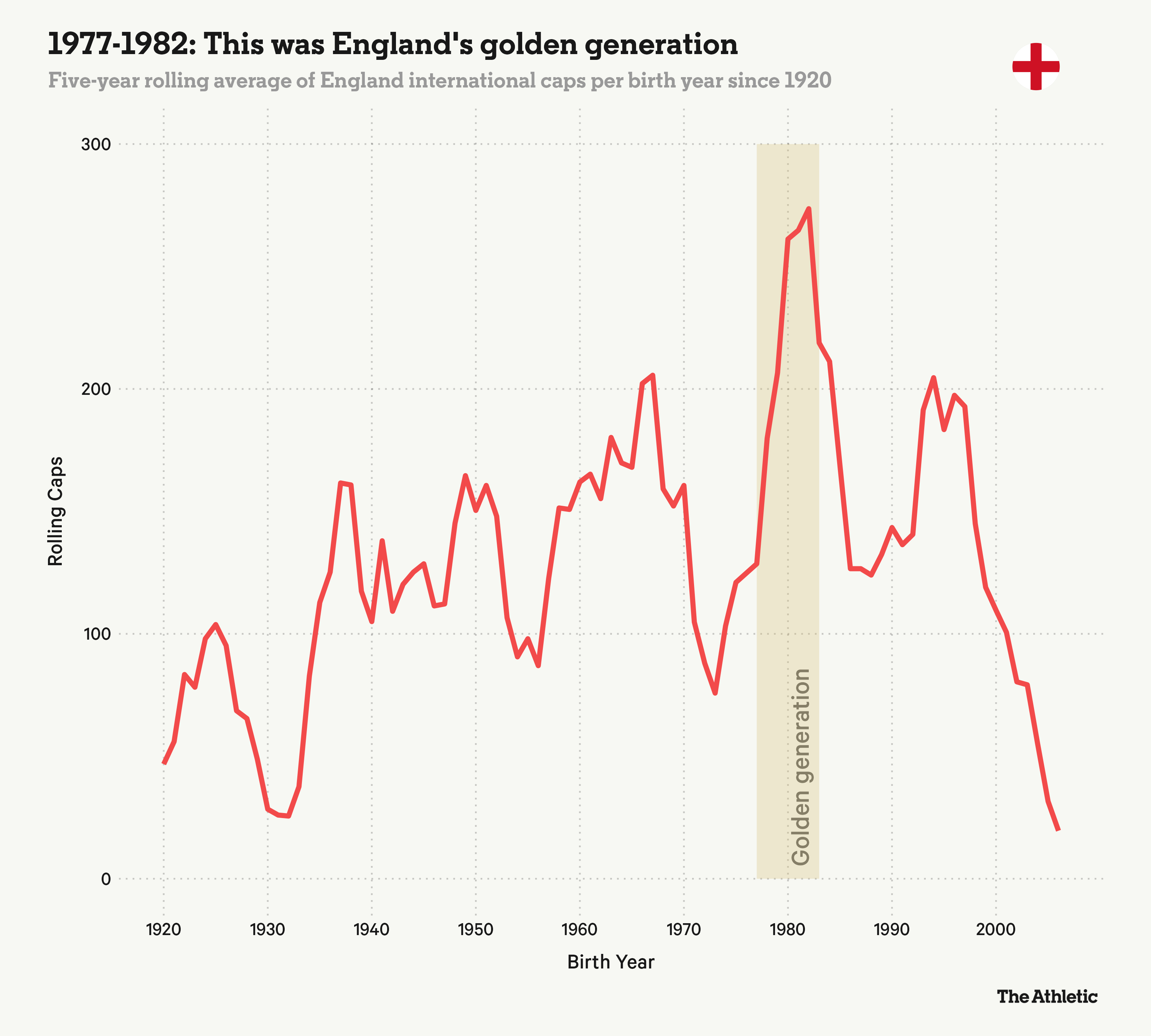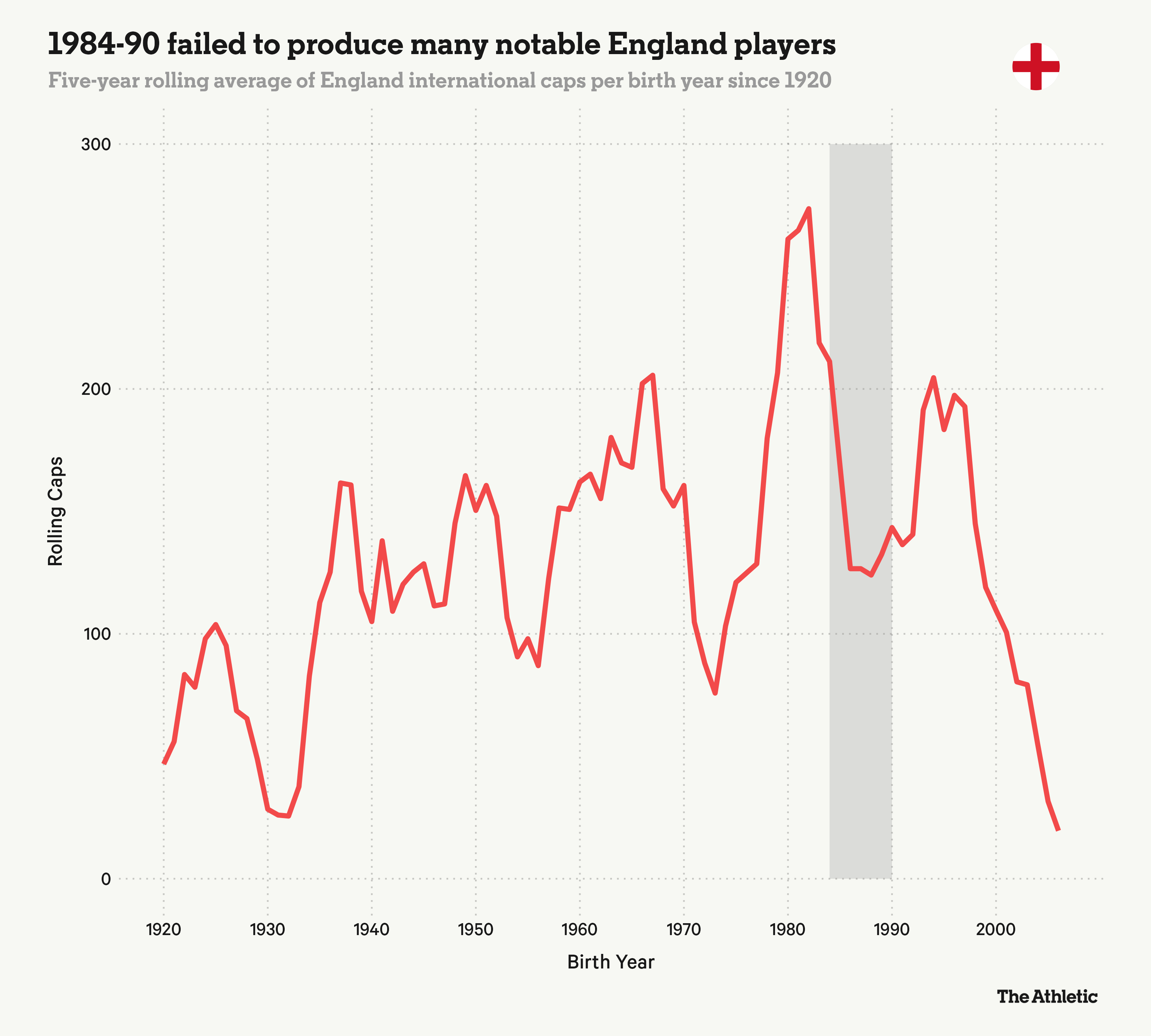 Golden generations are, almost by nature, generally followed by a less impressive one. For England, the mid-to-late 1980s was a particularly poor period. Yes, it featured Wayne Rooney (1985) and Joe Hart (1987), who went on to reach 120 and 75 caps respectively. But otherwise, there were a lot of functional, workmanlike players born: Gary Cahill (1985) and James Milner (1986) are the only others who reached the 50-cap mark.