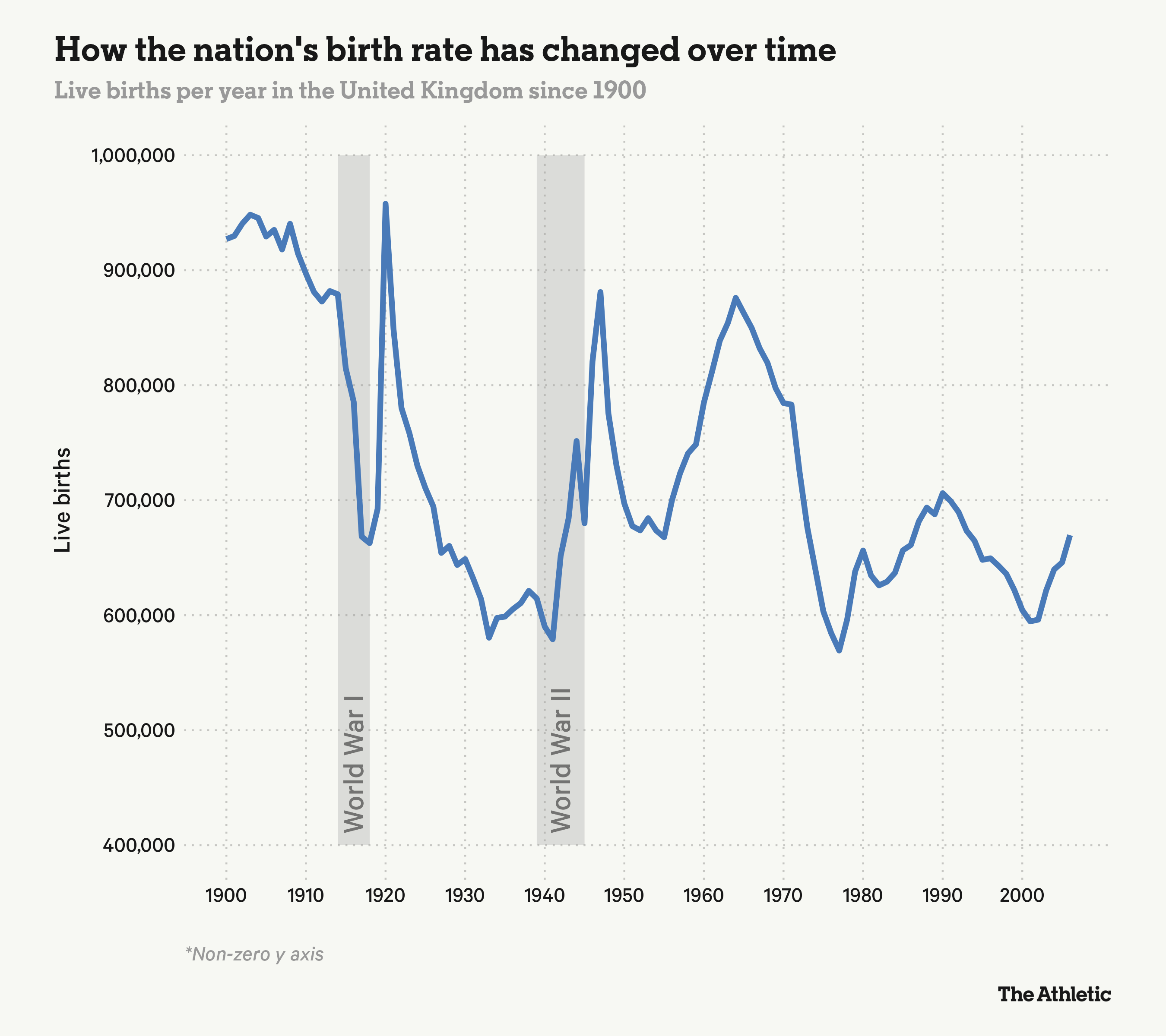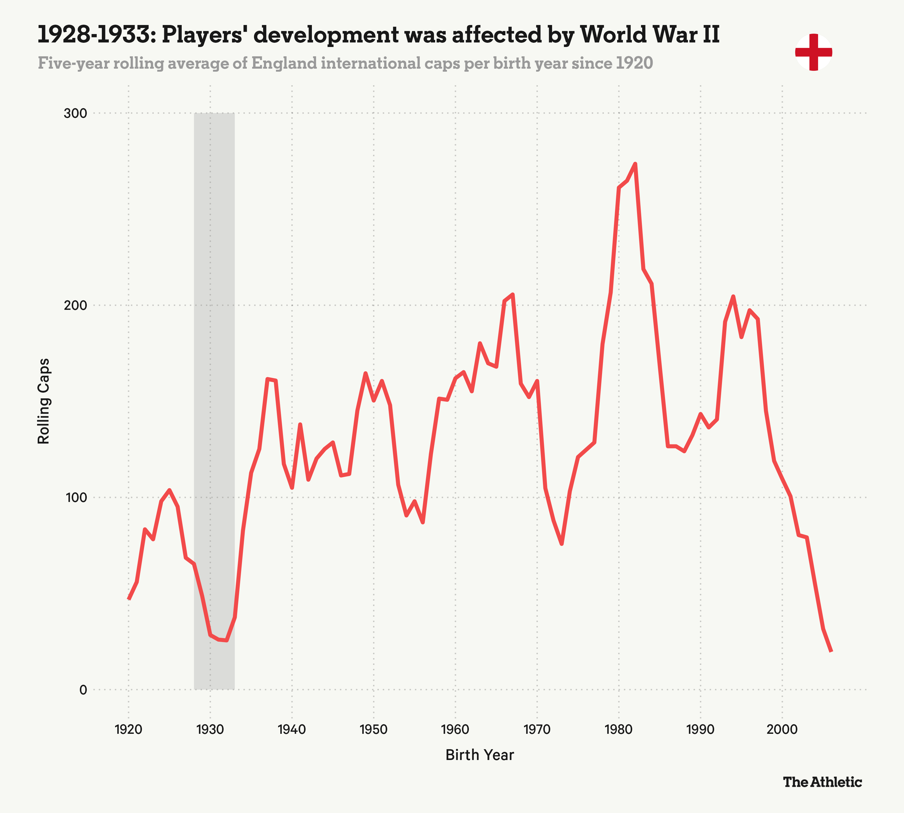 And the noticeable dips also don’t come for the generations of players who would be expecting to play their peak years for England during wartime either — note the lack of games in the 1940s in the earlier graph.