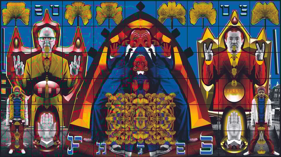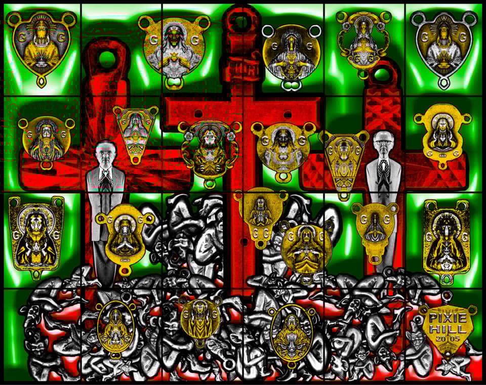 The merging of sacred symbols of faith and lucky charms collapses the divide between organised religion and superstition. Gilbert & George prompt us to consider how belief systems function.