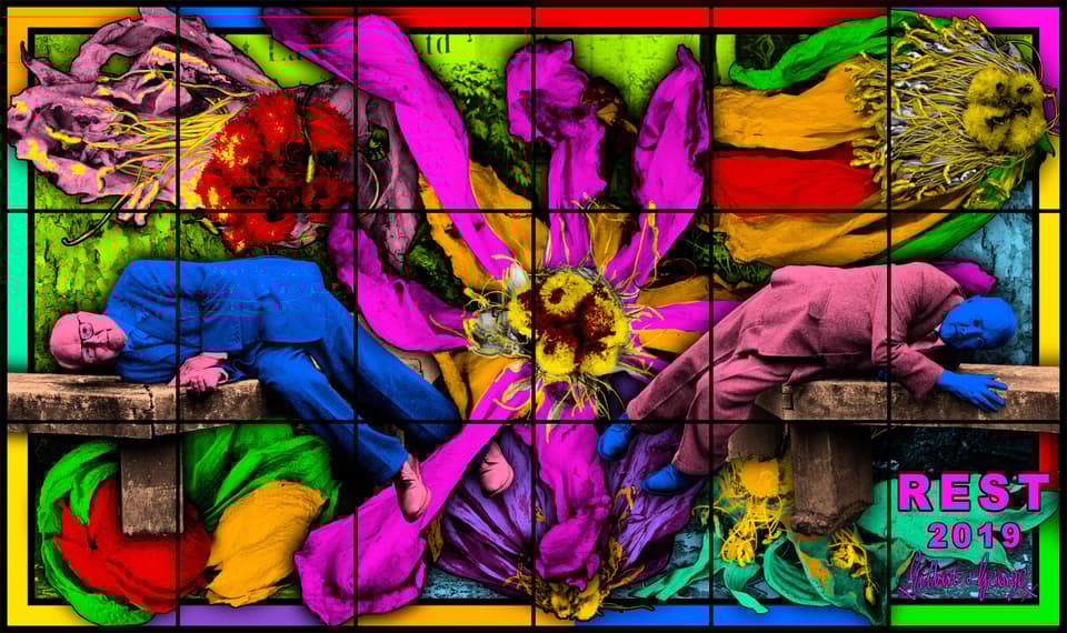 Gilbert & George wander through this brightly coloured afterlife, filled with fruits, flowers, leaves and trees, merging into the plant kingdom. There is a common motif of blossoming in nature – usually a joyful event, but on closer inspection the flowers are fading, the fruits are dried, and Gilbert & George exude exhaustion, lying awkwardly across a bench.