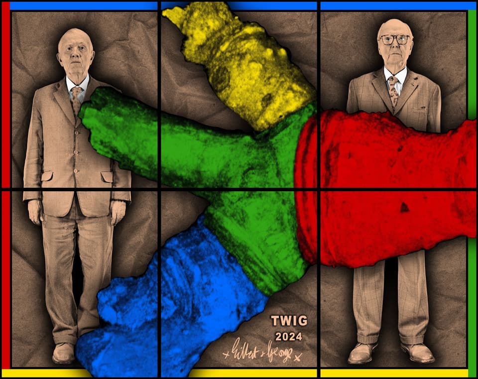 Gilbert & George appear as two digitally manipulated silhouettes, seemingly dissolving into the background, resembling ghostly astral bodies.