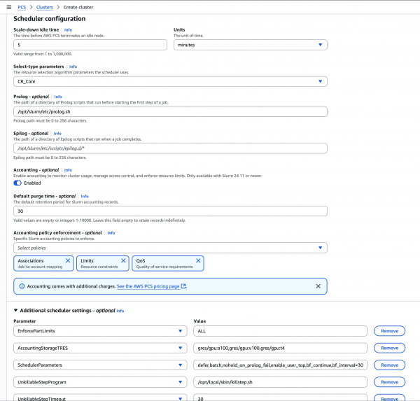 To explore the new functionality, log in to the AWS PCS console and open the Additional scheduler settings section when creating or editing clusters, queues, or node groups. For a programmatic approach, add SlurmCustomSettings to your CLI or SDK calls.Documentation for each parameter is available in the official Slurm manual.