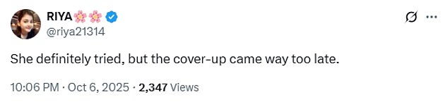 ‘She definitely tried, but the cover-up came way too late,’ another typed.