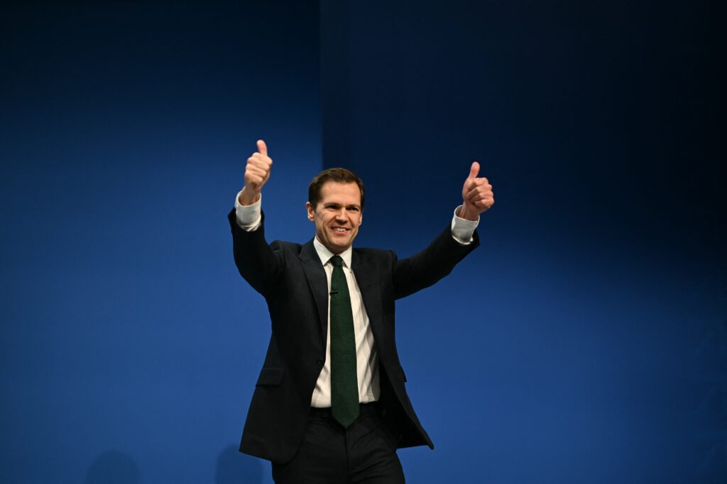 Britain’s main opposition Conservative Party Shadow Justice Secretary Robert Jenrick gestures at the end of his speech on the third day of the annual Conservative Party conference in Manchester. | Oli Scarff/AFP via Getty Images