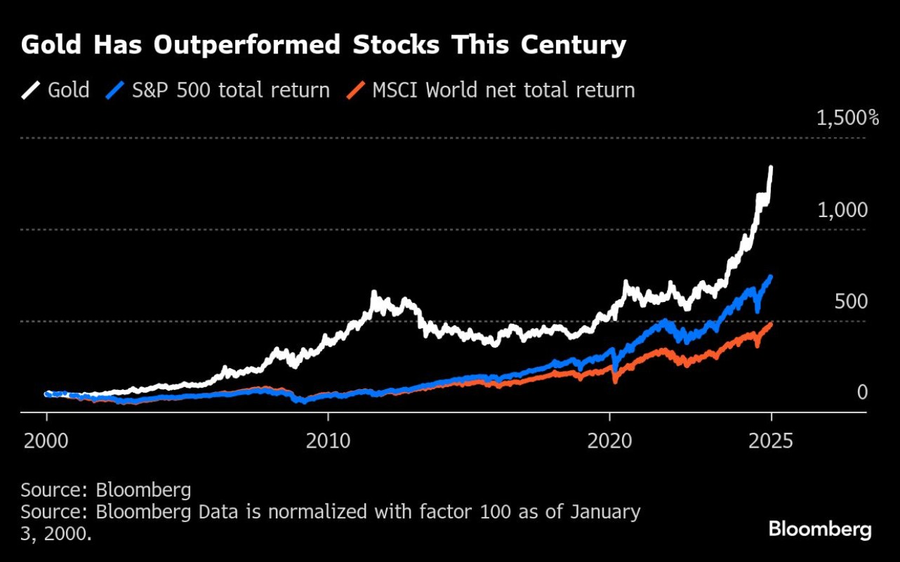 It’s a milestone for bullion, which traded below US$2,000 just two years ago, with returns that now outstrip those for equities this century. Gold has jumped more than 50% this year in the face of uncertainties over global trade, the Federal Reserve’s independence, and US fiscal stability.