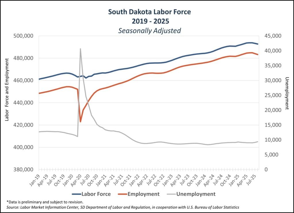 In August, South Dakota’s labor force dropped by 600 people to 492,700 from the previous month. A year ago, it was 490,000.