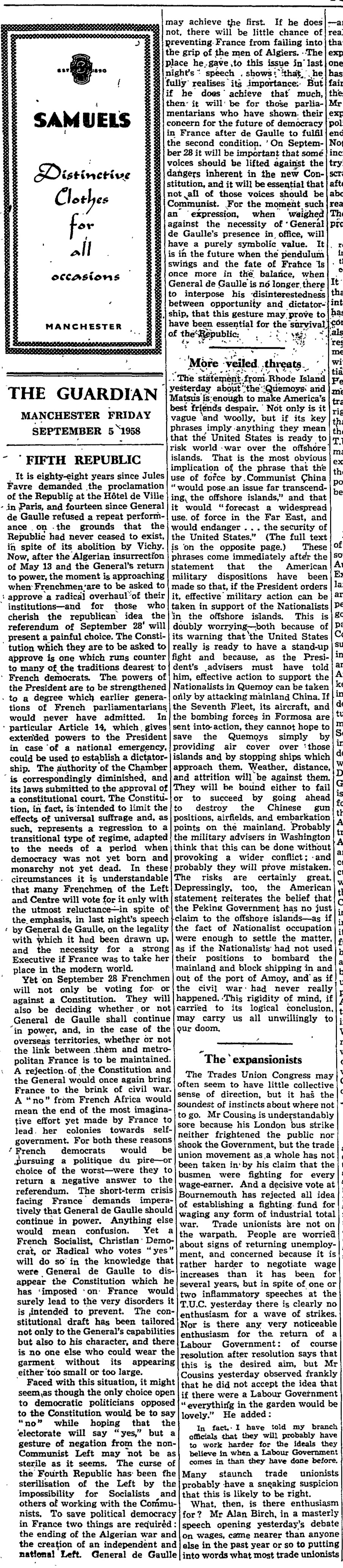 On 28 September, in the referendum on his new constitution, General de Gaulle will sweep into a single net the votes of Africans welcoming the right to secede and of conservative Frenchmen who want a strong government to discourage if not prevent any such secession; of General Chassin, leader of the “May 13 movement,” who says that his “yes” is for a French Algeria and integration but not for the constitution, and that of M. Gaston Defferres, the Socialist mayor of Marseille, who wants a stable government to negotiate with the Algerian rebels. Leaders of the centre and left talk of a new government that will at last be able to carry out their parties’ policies; leaders of the Right rub their hands in joy at the hope of an electoral law which will at last give them a majority in the assembly, even if they do not possess it in the country.