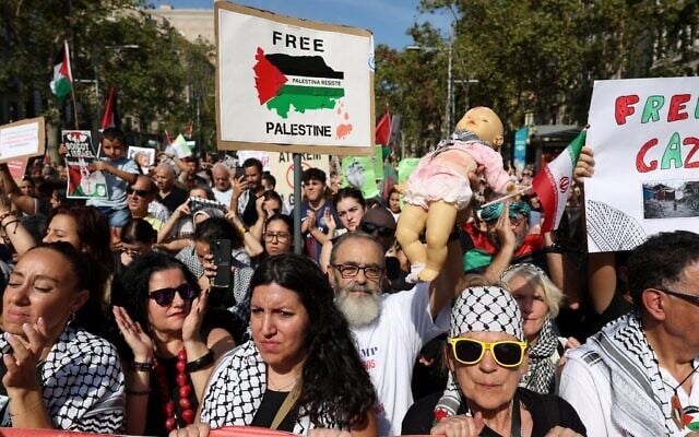 People march in an anti-Israel protest against the war in Gaza, in Barcelona, Spain, October 4, 2025. (Lluis GENE / AFP)