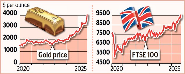 On a record-breaking day on financial markets, the FTSE 100 rose 0.7 per cent, or 65.29 points to an all-time high of 9548.87, while bullion hit $4,059 an ounce.