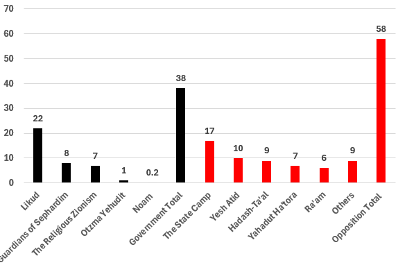 The most recent Pew survey, which is available in raw form, was completed in May 2024. It polled respondents in 35 countries, including Israel. The chart above shows support for the various political parties in the Israeli survey. Black columns are the parties in the government coalition; red columns the parties in opposition. The war had been going on for just over seven months when the survey was conducted. At that time, 38% of respondents supported the governing parties, and 58% the opposition parties.