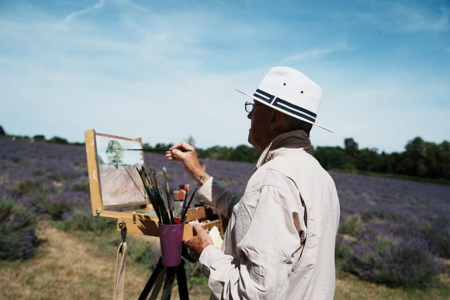 A visitor sketches at Mayfield Lavender Farm in Surrey, England, Britain, July 4, 2025. (Xinhua/Zhao Jiasong)