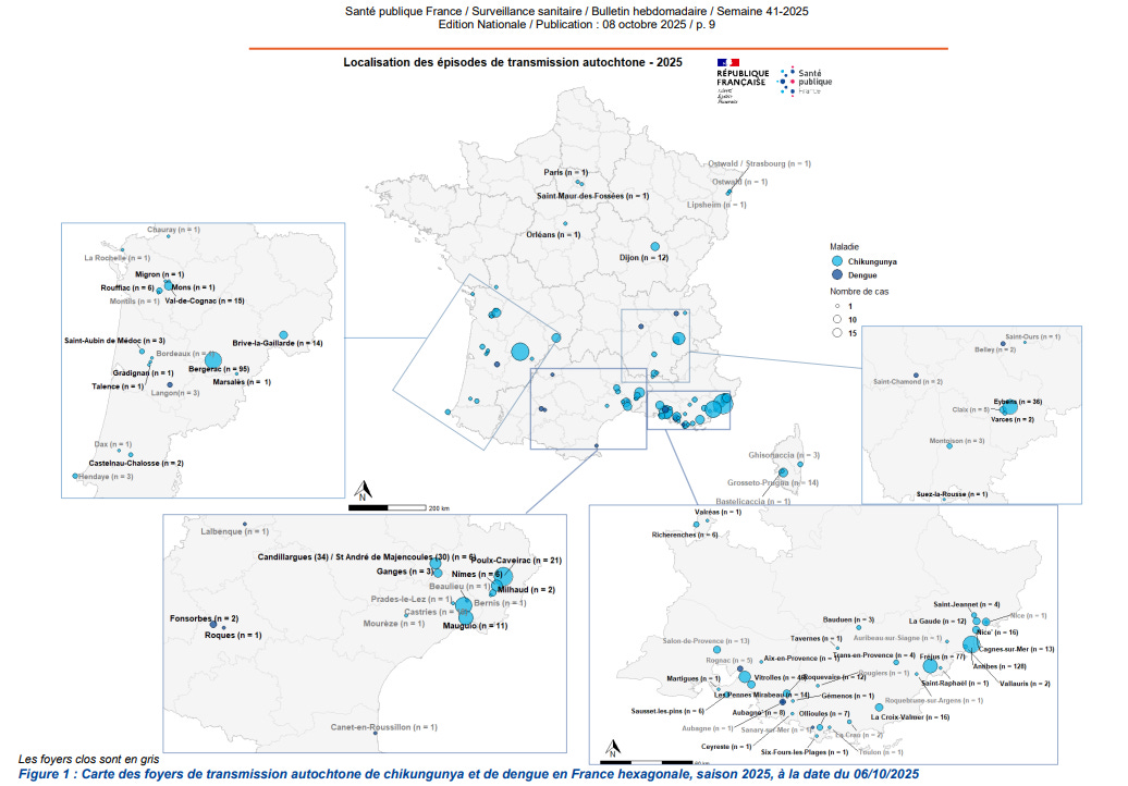 As of October 6, 2025, 87 outbreaks of indigenous vector-borne transmission of chikungunya and dengue fever and a total of 737 cases have been identified in mainland France: