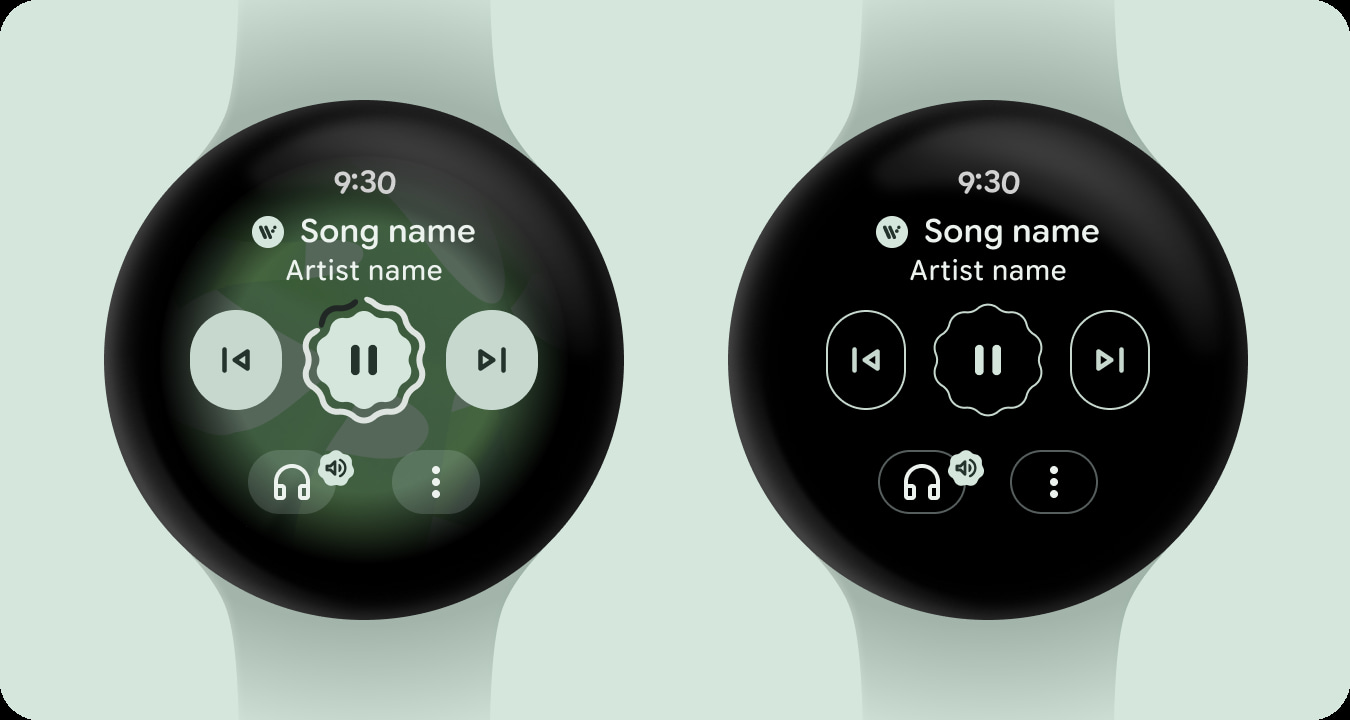 The example Google provided was how the “current song and media controls remain visible even when the user isn’t interacting with the Wear OS device.” At the left (above), we see the redesigned Material 3 Expressive Media Controls that went live on the Pixel Watch 4, and the Wear OS 6 update for the Pixel Watch 2 and 3. (The other tweak Google made was adding a music note icon for the complication and at the bottom of your watch face.)