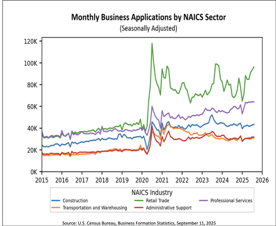 In August, the number of business applications rose 0.5% from the prior month, continuing an uptrend that began earlier this year despite a brief retreat that coincided with Trump’s tariff rollout, which triggered chaos in financial markets as duties headed for the highest levels in nearly a century.