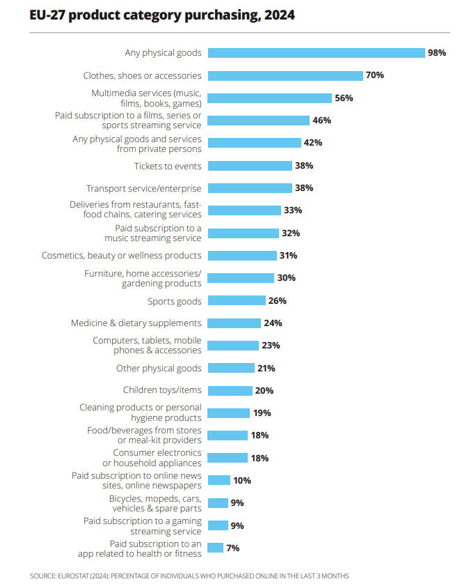 70% of European online shoppers buy clothing, footwear and accessories, placing the category well ahead of multimedia products (56%) and streaming subscriptions (46%), according to 2024 figures recently published by Ecommerce Europe, the online retail confederation.