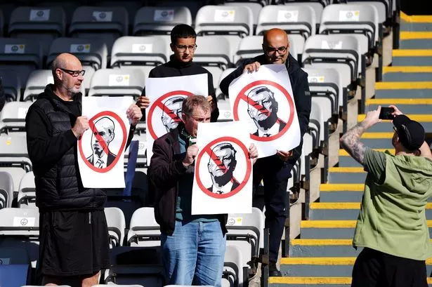 Celtic fans hold banners in protest of Celtic board members Peter Lawwell and Michael Nicholson