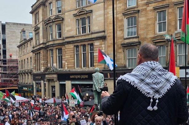 Protesters listen to Husam Zomlot, the Palestinian ambassador to the UK at Buchanan steps(Image: X/Gaza Genocide Emergency Committee)