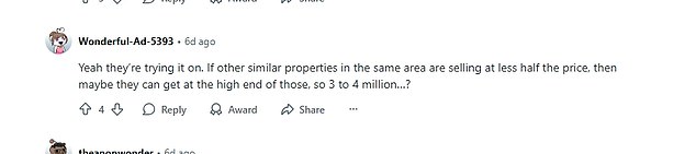 Another said: ‘£2.5m is insane money for this. Surely its not worth even close to that. Even at half, it would be steep, no?’