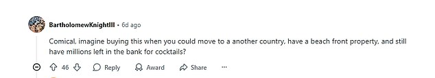 Another laughed: ‘Comical, imagine buying this when you could move to a another country, have a beach front property, and still have millions left in the bank for cocktails?’
